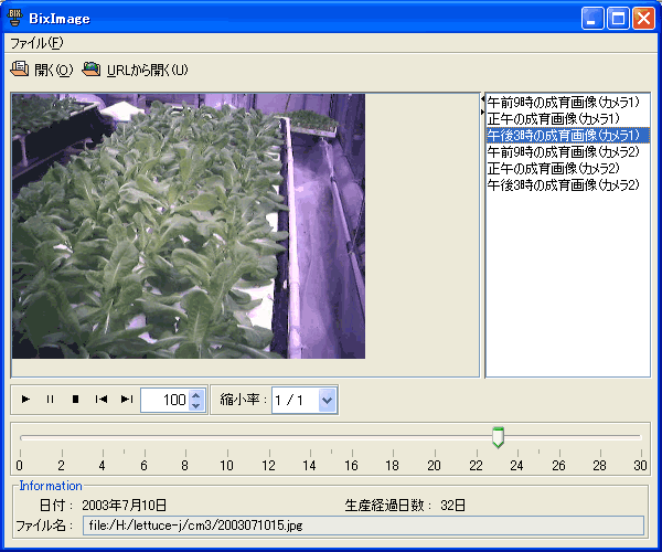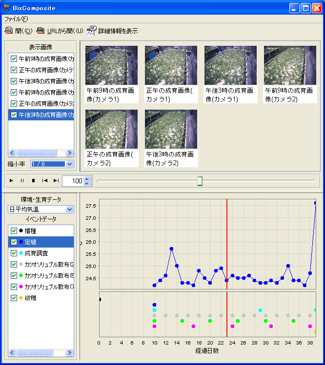 生産情報統合ビューア BixComposite 記録されている画像データ、環境計測データ、生育計測データ、作業データ等を、一度に表示することができます。各データを日付をキーに関連付けて閲覧したり、画像を動画のように再生できます。Java言語及びEclipseで開発されています。実行には、Java softwareが必要になります。実行形式JARファイルを実行してください。 詳しくはBixCompositeに関する学会発表要旨をご覧下さい。これは農業環境工学関連4学会2004合同大会の講演要旨に掲載したものです。PDF形式で記載されていますので、閲覧にはAdobe Acrobat Reader (R)が必要です。 |