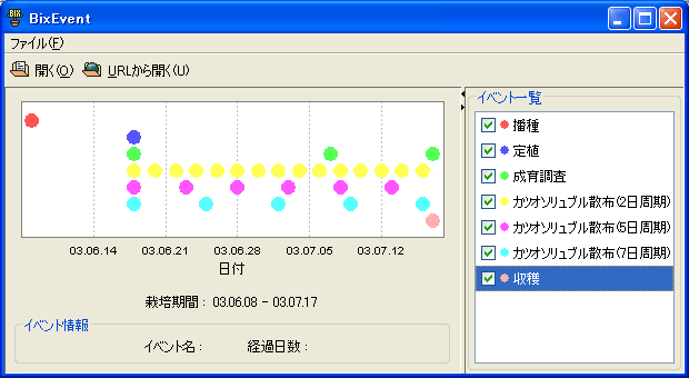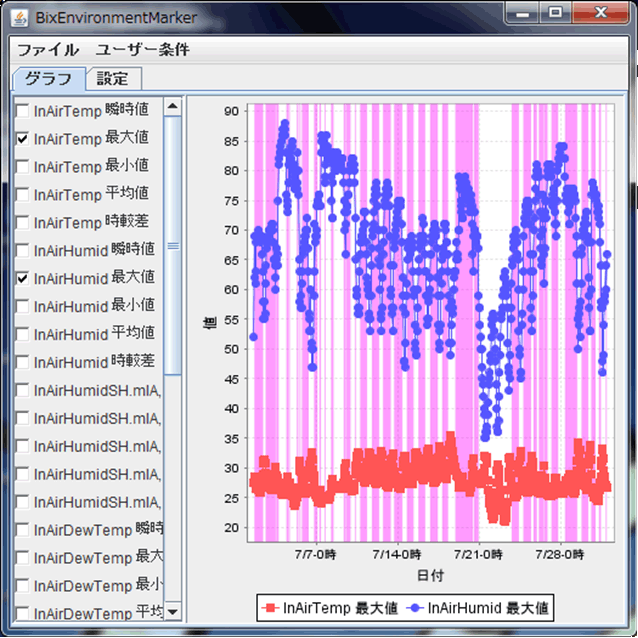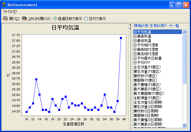 環境計測・生育計測データビューア BixEnvironment 記録されている環境計測データや生育計測データをグラフで見ることができます。Java言語及びEclipseで開発されています。実行には、Java softwareが必要になります。実行形式JARファイルを実行してください。 |