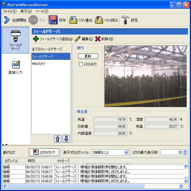 生産情報自動収集プログラム BixFieldRecordServer 様々な植物生産情報を、BIX-pp形式で手軽に記録できるプログラムです。 生産現場に設置されたフィールドサーバやWebカメラを利用して、温度や湿度などの環境情報、植物成育画像などを自動記録できます。 また、生産解析に必要な、栽培管理作業や成育測定情報などの情報を、手動入力で補えます。 Java言語及びEclipseで開発されています。実行には、Java softwareが必要になります。 実行形式JARファイルを実行してください。 このプログラムは、イーラボ・エクスペリエンス製のフィールドサーバIIに対応しています。 また、フィールドサーバについての詳細はField Server: Homeをご覧下さい。 最新版に修正しました。(2006,7,31) |