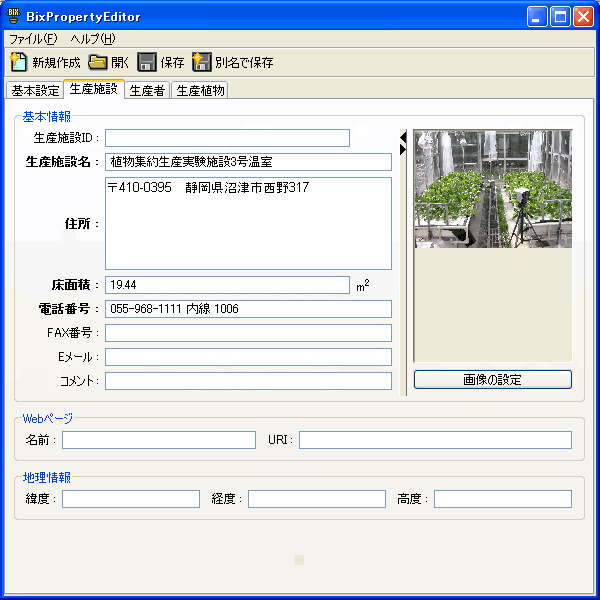 生産情報編集プログラム BixPropertyEditor 生産者、生産施設、品種、栽培方法などの生産情報を編集できます。XMLの知識がなくても、フォームに入力するだけで、BIX-pp形式の生産情報オブジェクトが作成できます。Java言語及びEclipseで開発されています。実行には、Java softwareが必要になります。実行形式JARファイルを実行してください。 |