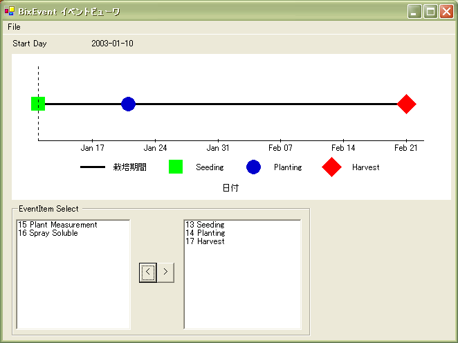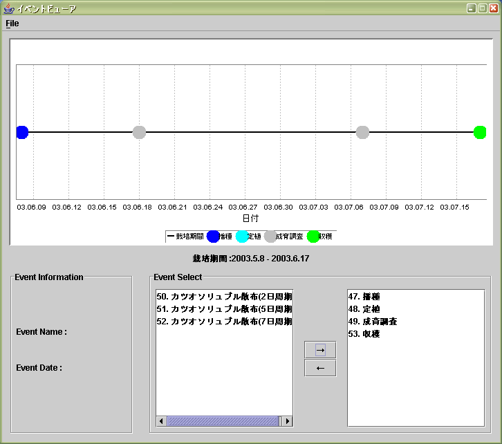 イベントビューワー 記録されている作業や出来事を一覧できます。栽培の作型図のような表示形式にしています。Eclipseで開発されています。実行には、Java softwareが必要になります。実行形式JARファイルを実行してください。 |