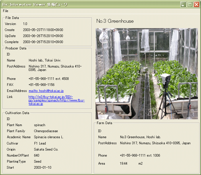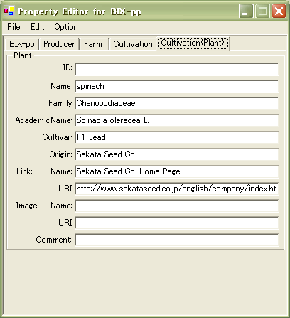 生産情報編集プログラム 生産者、生産施設、品種、栽培方法などの生産情報を編集できます。XMLの知識がなくても。フォームに入力するだけで、BIX-pp形式の生産情報オブジェクトが作成できます。MS VB.Netで開発されています。Setup.exeでパソコンにインストールしてご使用ください。ご使用の環境によって、実行には、MS .Net Frameworkが必要になります。インストールの指示に従って、ダウンロードしてください。 |