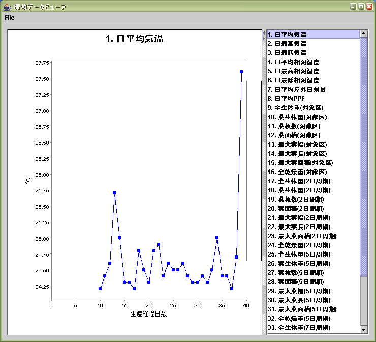生育データビューワー 記録されている環境計測データや生育計測データをグラフで見ることができます。Eclipseで開発されています。実行には、Java softwareが必要になります。実行形式JARファイルを実行してください。 |