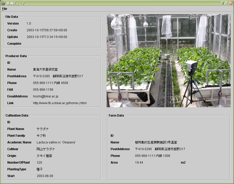 生産情報ビューワー 生産者、生産施設、品種、栽培方法などの生産情報を表示できます。Eclipseで開発されています。実行には、Java softwareが必要になります。実行形式JARファイルを実行してください。 |