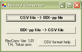 生産データ変換プログラム CSV(カンマ区切り形式)で記述された環境計測データ、生育計測データ、画像データ、音声データ、作業データをBIX-pp形式に変換します。また、BIX-pp形式のこれらのデータをcsv形式にも変換できます。MS VB.Netで開発されています。Setup.exeでパソコンにインストールしてご使用ください。ご使用の環境によって、実行には、MS .Net Frameworkが必要になります。インストールの指示に従って、ダウンロードしてください。 |