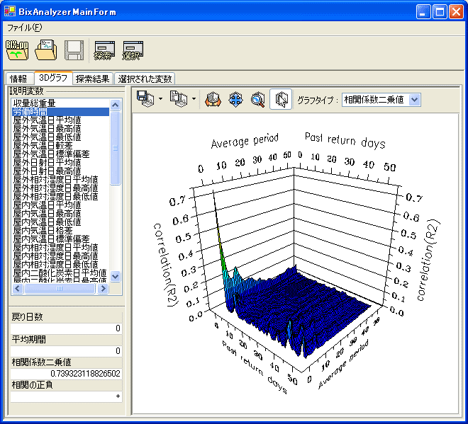 生産に関係する要因と影響期間の解析プログラム BixAnalyzer BIX-ppで記述された毎日の生産量と各要因について、平均期間を変えながら相関解析するプログラムです。βバージョンです。MS VB.Netで開発されています。Setup.exeでパソコンにインストールしてご使用ください。ご使用の環境によって、実行には、MS .Net Frameworkが必要になります。インストールの指示に従って、ダウンロードしてください。 |