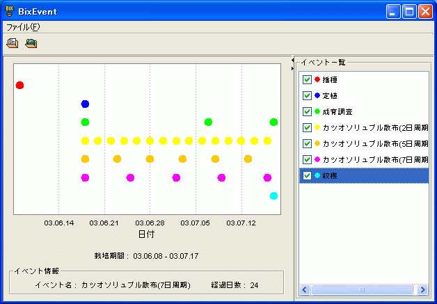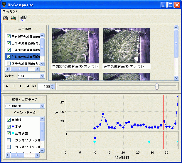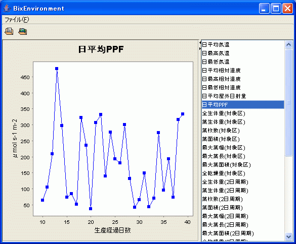 環境計測・生育計測データビューア BixEnvironment 記録されている環境計測データや生育計測データをグラフで見ることができます。Java言語及びEclipseで開発されています。実行には、Java softwareが必要になります。実行形式JARファイルを実行してください。 |