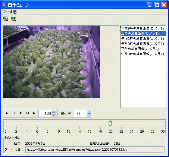 生産情報統合ビューア BixComposite 記録されている画像データ、環境計測データ、生育計測データ、作業データ等を、一度に表示することができます。各データを日付をキーに関連付けて閲覧したり、画像を動画のように再生できます。Java言語及びEclipseで開発されています。実行には、Java softwareが必要になります。実行形式JARファイルを実行してください。 詳しくはBixCompositeに関する学会発表要旨をご覧下さい。これは農業環境工学関連4学会2004合同大会の講演要旨に掲載したものです。PDF形式で記載されていますので、閲覧にはAdobe Acrobat Reader (R)が必要です。 |