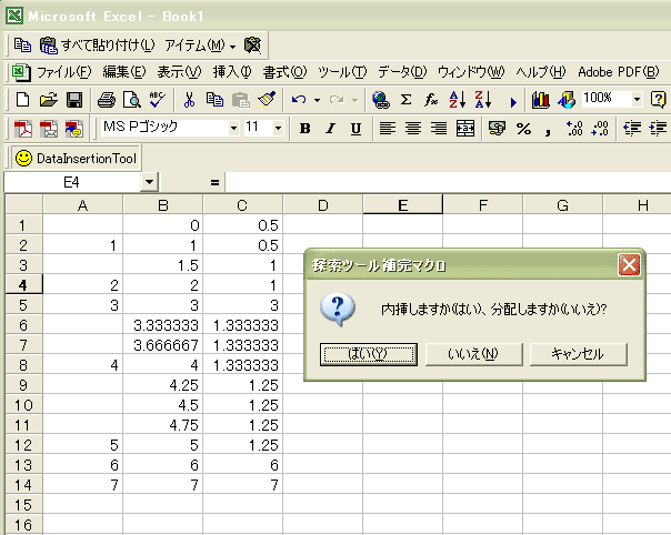 離散データの補間アドインプログラム BixDataInsertionTool CSVで記述されたデータで、飛び飛びに記録されている離散データを、内挿・分配して連続値に変換するプログラムです。MS Excel VBAで開発されています。実行にはMS Excelが必要です。MS Excelにアドインとして組み込んで御使用ください。 |